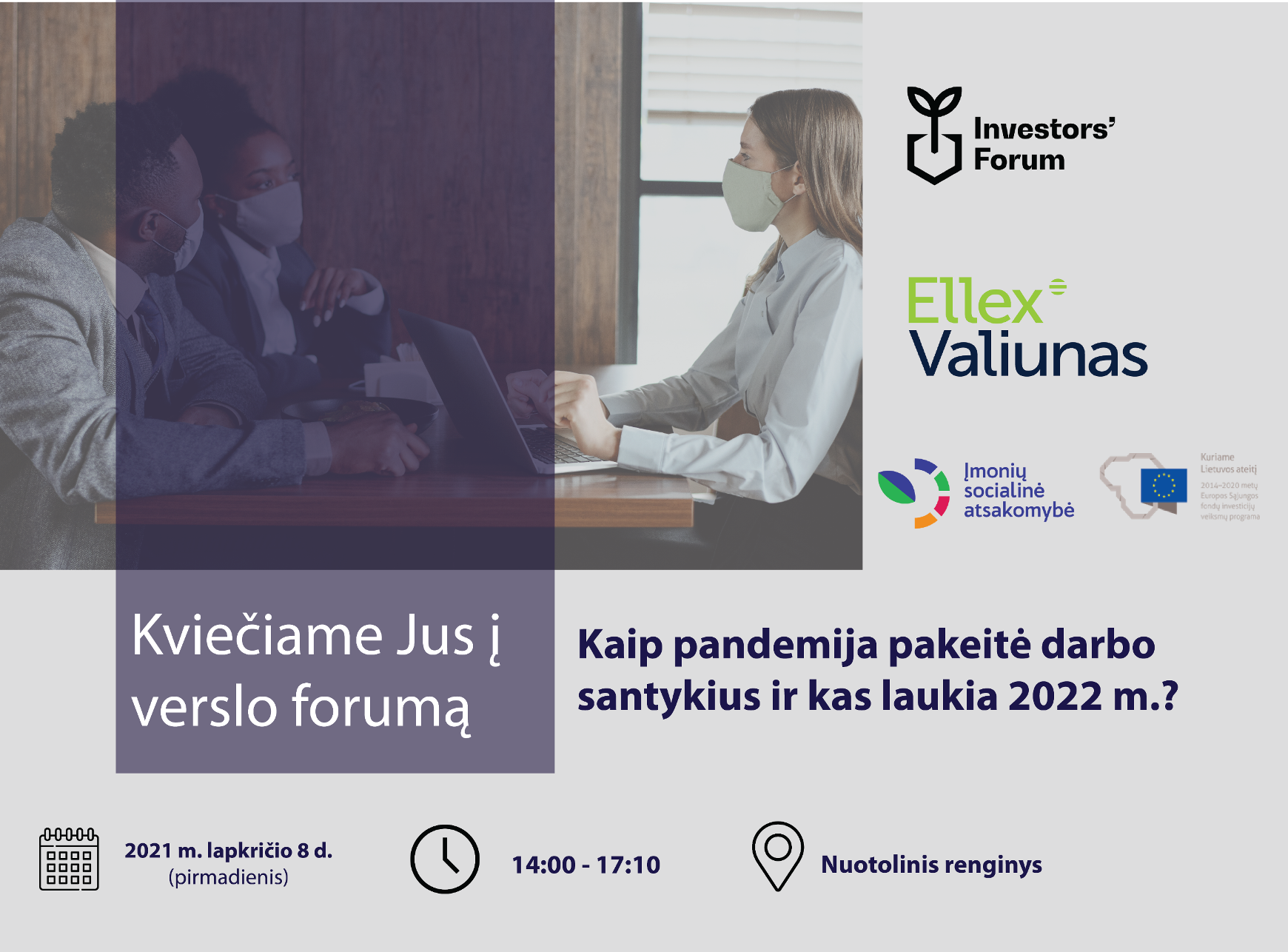 Nuo pat Covid-19 pandemijos pradžios, pagausėjo iššūkių valdant darbo santykius. Nors darbo kodeksas buvo koreguotas minimaliai, tačiau negalime paneigti – darbo santykius pandemija palietė ir pakeitė iš esmės. Karantino metu, mūsų įprastą darbo ritmą pakeitė nuotolinis darbas, skaitmenizavimo ir IT priemonių vaidmens išaugimas, darbdavių iniciatyvos dėl darbuotojų testavimo ir vakcinavimo. Pandemija atsiliepė darbo rinkai ir santykiams, ir kitais aspektais: atsirado darbuotojų trūkumas atskiruose sektoriuose, nors absoliutus bedarbių skaičius yra padidėjęs, vis labiau kalbama apie poreikį įsileisti darbuotojus iš trečiųjų šalių. Verslo ir darbdavių socialinė atsakomybė tampa būtinu standartu, siekiant padidinti darbdavio patrauklumą darbuotojams. Kartu, išliko ir visuomet aktualios temos (apie kurias Lietuvoje vis dar mažai kalbama), tokios kaip mobingas ar diskriminacija darbe. Lapkričio 8d., 14:00 val. kviečiame į verslo forumą „Kaip pandemija pakeitė darbo santykius ir kas laukia 2022 m. ?“, kurio metu pasidalinsime ne tik ekspertų įžvalgomis, aptarsime šias temas socialinės atsakomybės kontekste, bet ir pristatysime gerąsias įmonių praktikas bei aptarsime ko galime tikėtis ateinančiais, 2022-ais metais.